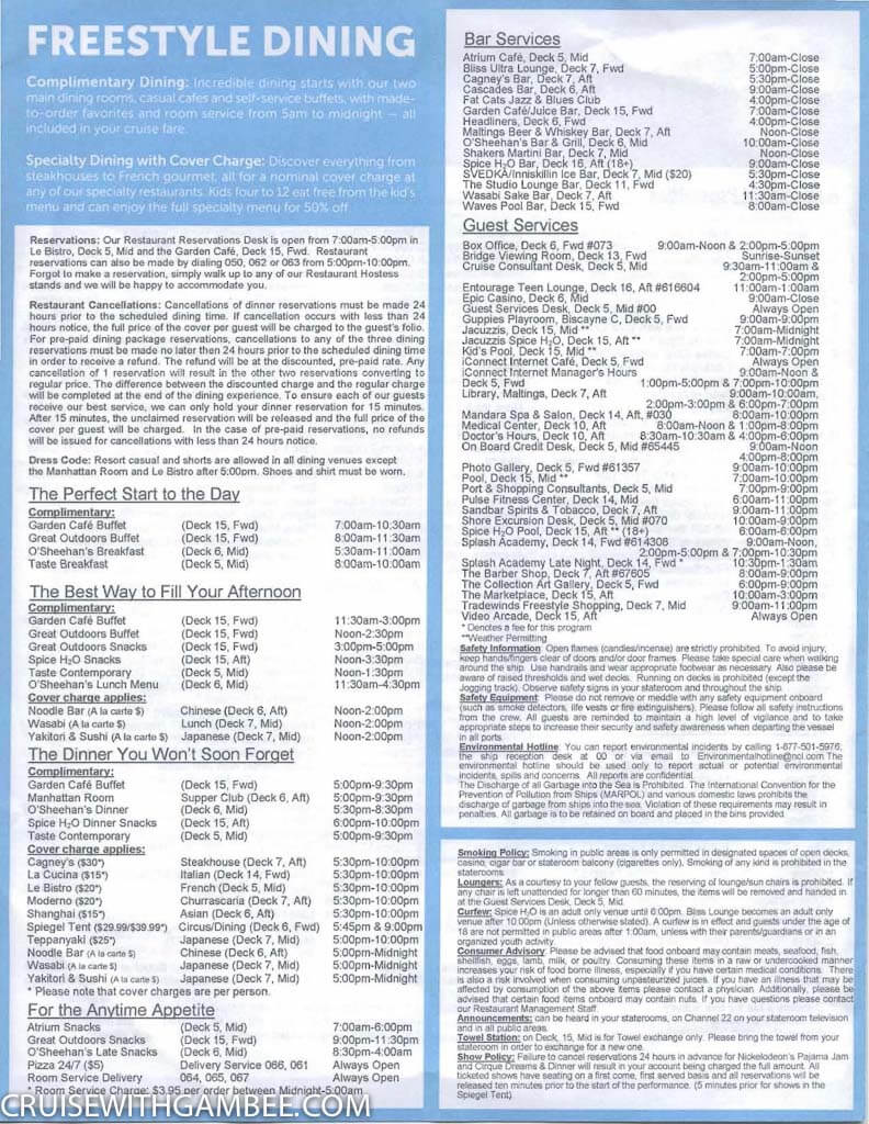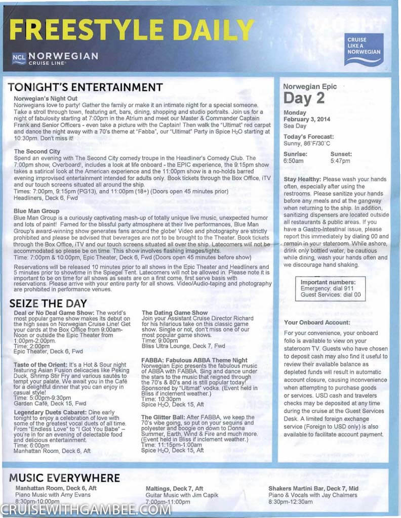 Here is the Norwegian Epic FreeStyle Daily Paper for Eastern itinerary. To help you plan entertainment, activities, spa, specialty venues, pool times, internet and much more. It is good to know what the cruise will be like ahead of time so you’re able to make the most out of each day of your family vacation.