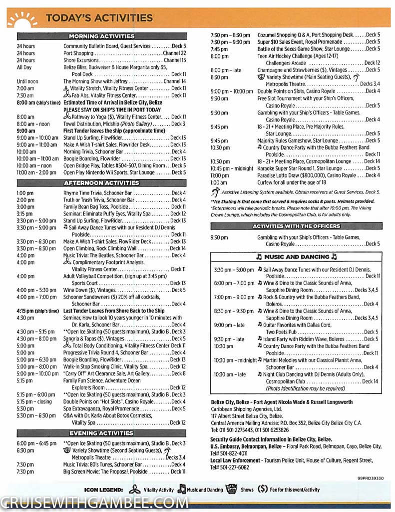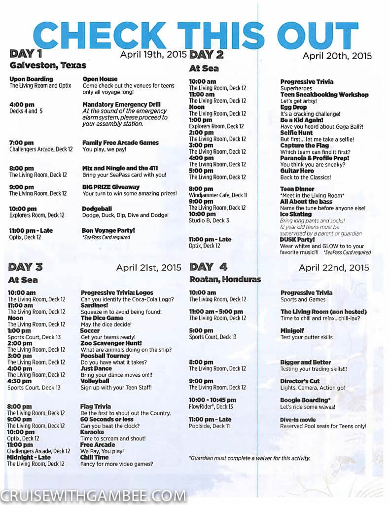 Here is the Royal Caribbean Navigator of the Seas Daily Cruise Compass Paper from the Eastern itinerary to help you plan entertainment, activities, spa, specialty venues, pool times, internet and much more. It is good to know what the cruise will be like ahead of time so you’re able to make the most out of each day of your family vacation.