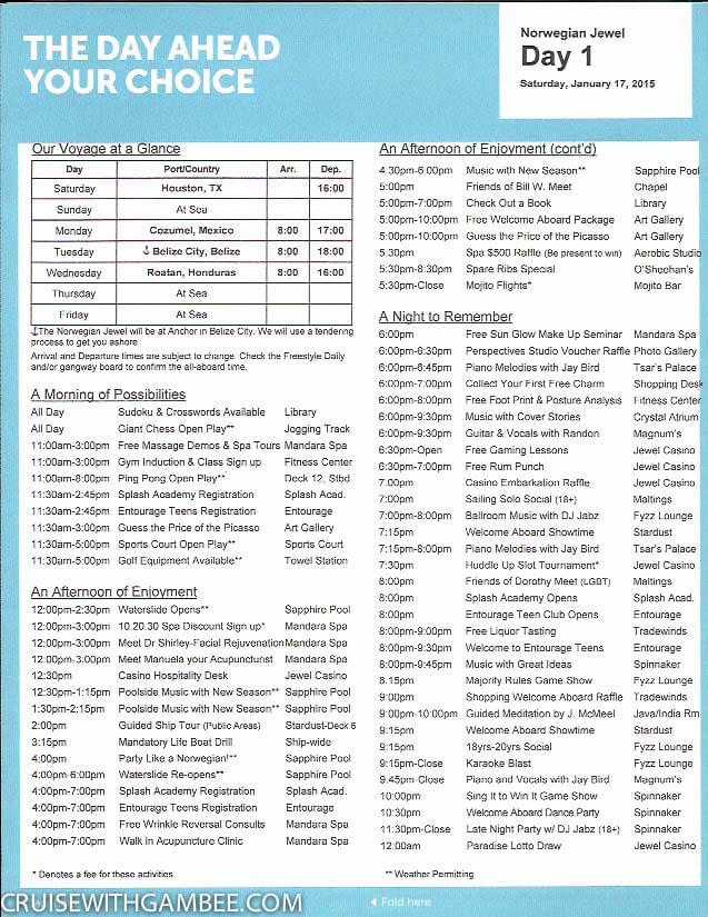 Here are the Norwegian Jewel FreeStyle Daily Papers. To help you plan entertainment, activities, spa, specialty venues, pool times, internet and much more. It is good to know what the cruise will be like ahead of time so you’re able to make the most out of each day of your family vacation.